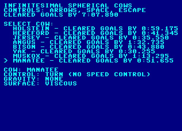 Pilot infinitesimal spherical cows in time trials inspired by classic top-down driving and spaceflight games.